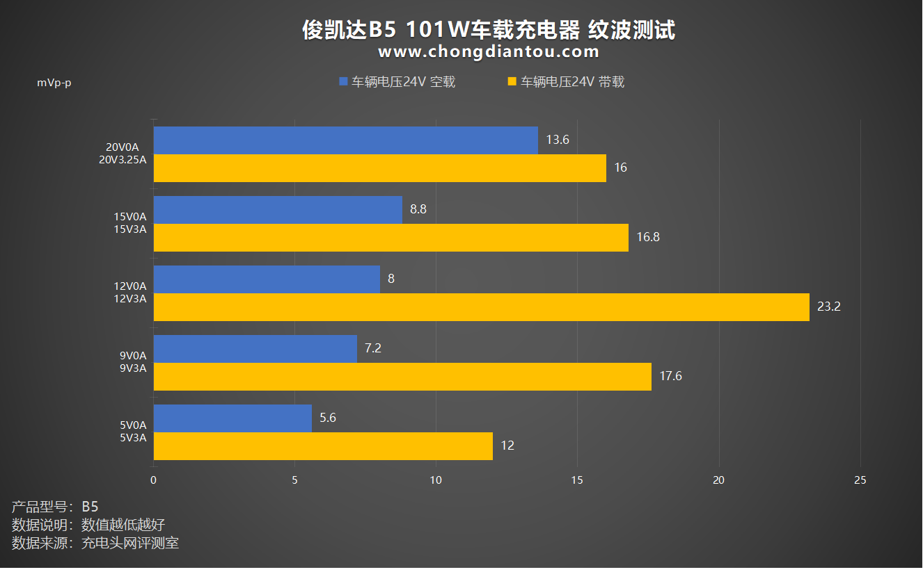 将测试的数据绘制成柱状图,可以看出俊凯达B5 101W车载充电器在24V车辆电压的空载状态下,纹波峰峰值最高的档位是20V0A纹波峰峰值13.6mVp-p,纹波最低的档位是5V0A,纹波峰峰值为5.6mVp-p;再来看看带载状态下,纹波峰峰值最高的档位是12V3A,纹波峰峰值为23.2mVp-p,纹波峰峰值最低的档位是5V3A,纹波峰峰值为12mVp-p。