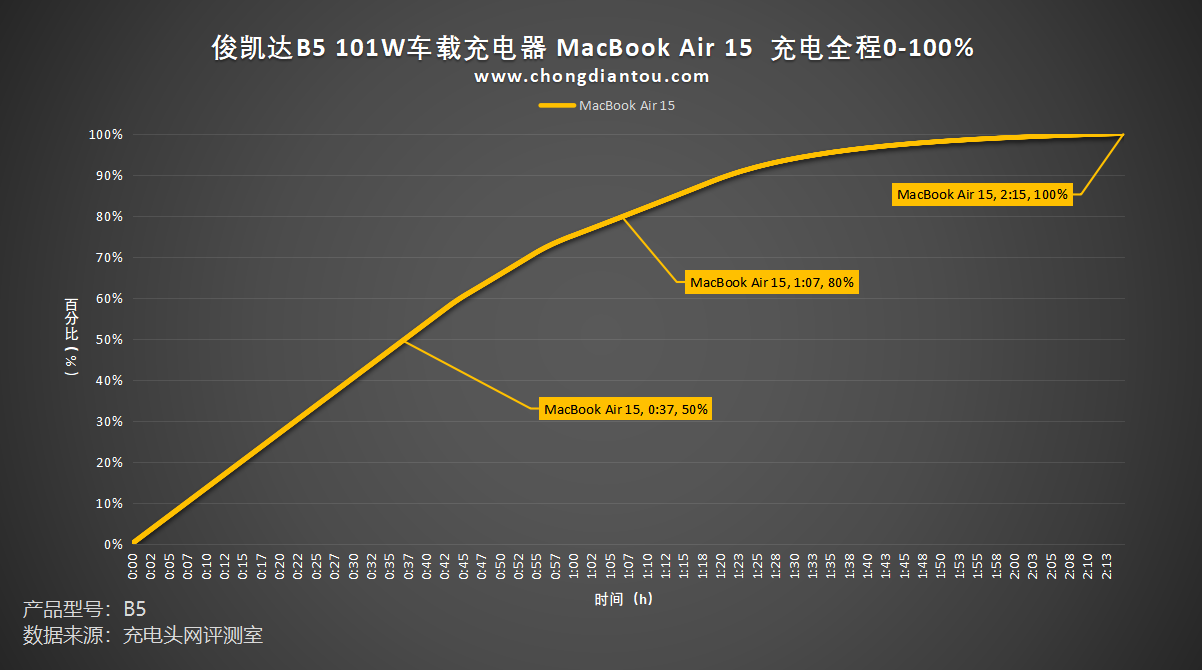 绘制成折线图,可以看出为 MacBook Air 15 充电50%耗时37分钟,充电至80%耗时1小时07分钟,充满电需要2小时15分钟左右。