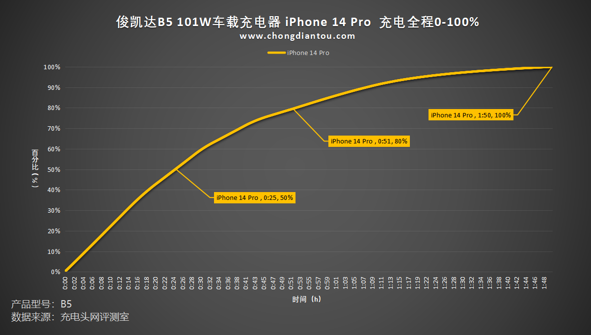 绘制成折线图,可以看出为iPhone 14 Pro 充电50%耗时25分钟,充电至80%耗时51分钟,充满电需要1小时50分钟左右。