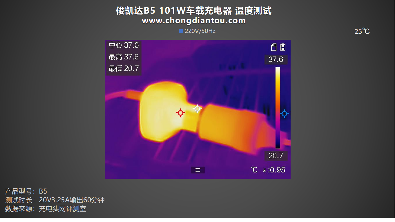 下面来看一下俊凯达B5 101W车载充电器的温控表现如何,将车充放在25℃的恒温箱中,C口以20V3.25A 65W的功率持续输出60分钟,然后使用热成像仪拍摄表面的温度。
