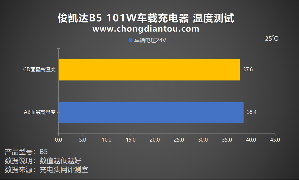 整体来说,俊凯达B5 101W车载充电器具备升压输出能力,在两类车辆电压下均拥有理想的输出能力,可为主流手机、平板以及笔记本电脑提供更高的充电功率;此外,它拥有 LED 显示屏,可视化输出,用户可更容易找到适配的设备,拥有更好地充电体验;同时,它持续满负载输出温度表现更低,与人体平均温度相差不大,用户出行充电更安心。