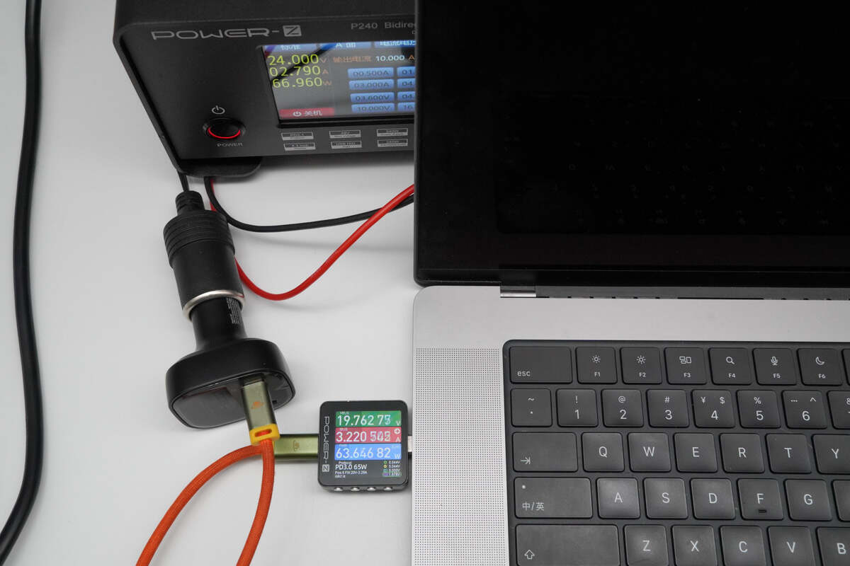 通过俊凯达B5 101W车载充电器 C2端口对MacBook Pro 16 笔电进行充电,实测当前充电功率为19.76V 3.22A 63.65W。