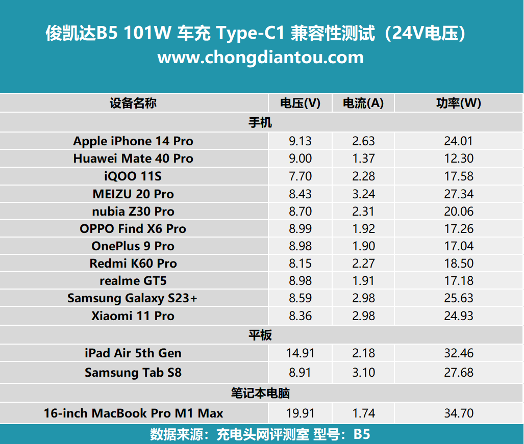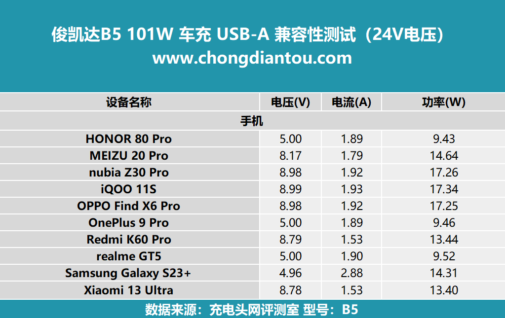 兼容性测试环节可以清楚的得知车充的各个接口为设备的充电情况,充电头网会使用数十款设备搭配进行测试,为读者呈现真实的测试数据。