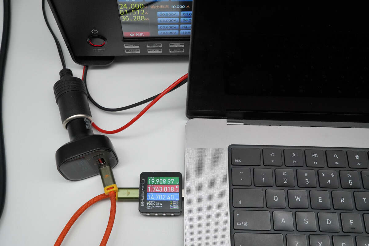 通过俊凯达B5 101W车载充电器对 MacBook Pro 16 笔电进行充电,实测当前充电功率为19.91V 1.74A 34.7W。