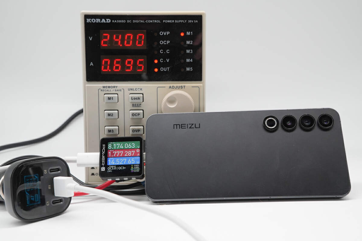 通过俊凯达B5 101W车载充电器 USB-A 端口对魅族 20 PRO手机进行充电,实测当前充电功率为8.17V 1.78A 14.53W。