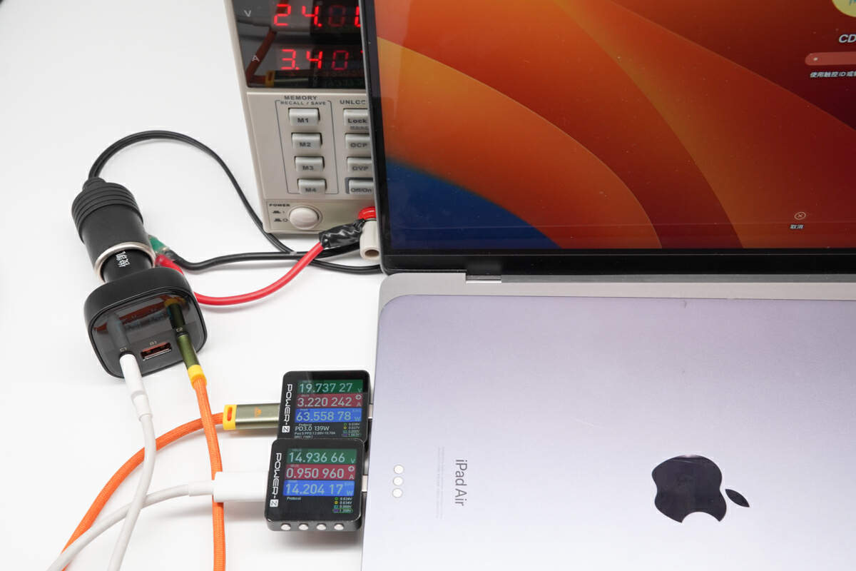 通过俊凯达B5 101W车载充电器的两个Type-C口对平板电脑、笔记本电脑进行充电,实测当前充电功率分别为14.2W、63.56W。