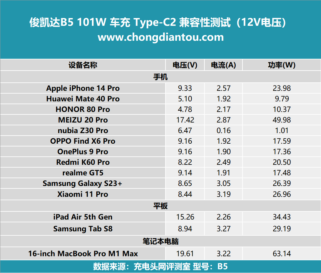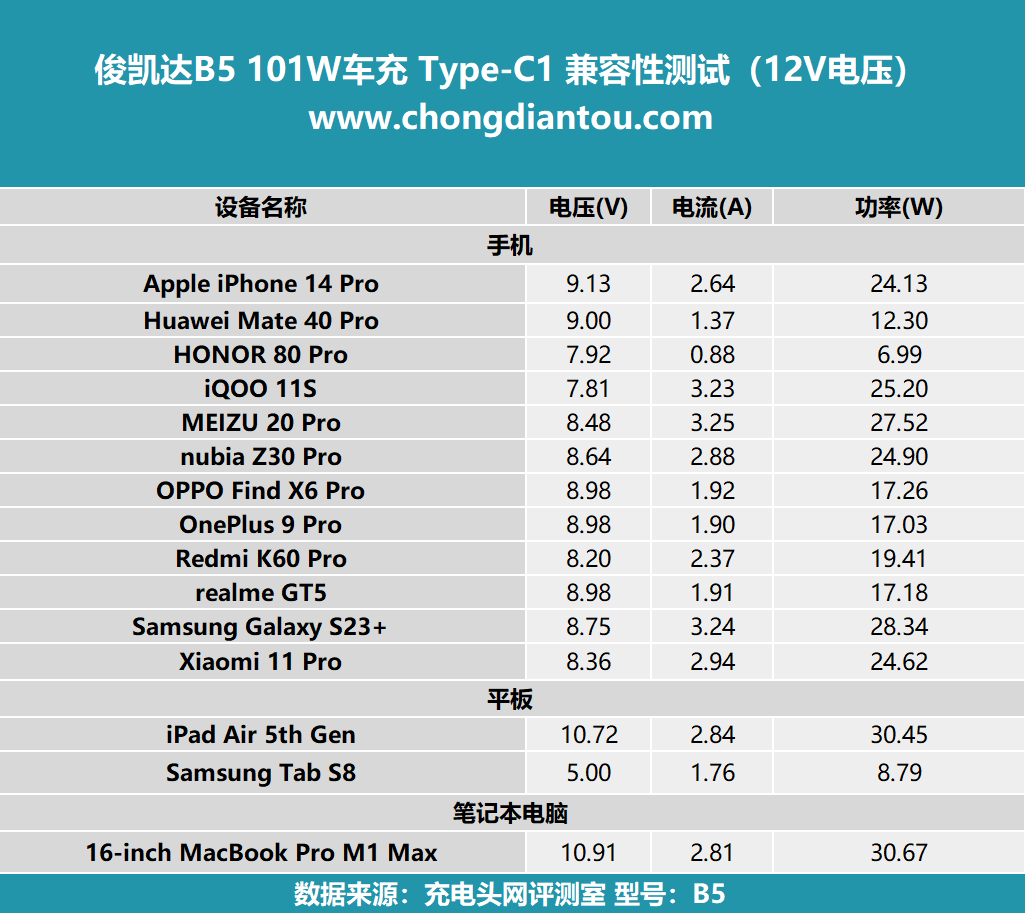 对以上主流设备进行充电实测,可以看到充电设备的输出功率表现与 12V 电压无明显差异。