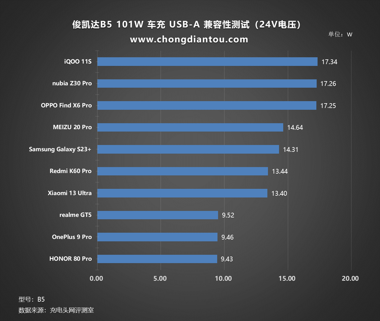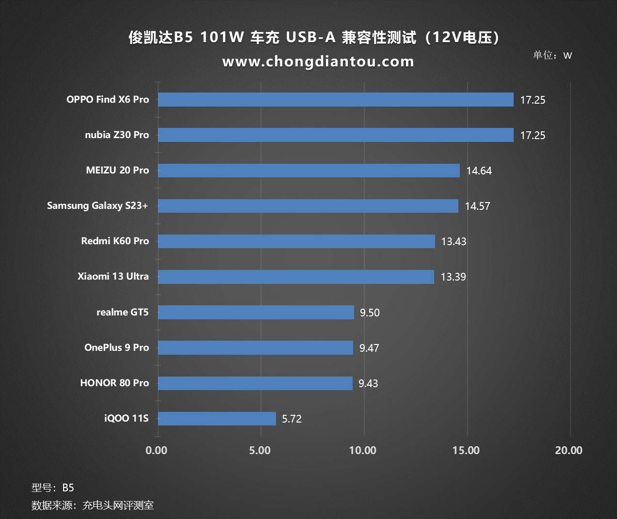 将以上设备充电功率绘制为柱状图,可以看到对于市面上的主流品牌手机,其充电功率维持在10W、15W两个档位,最高可达17.25W。