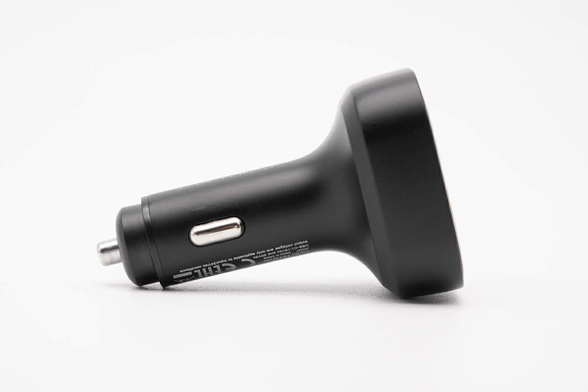俊凯达B5 101W车载充电器在外观上与传统样式车充无异,拥有 PC 防火材质制作外壳,壳体采用雾面哑光工艺处理,提升质感;插入端与输出端弧形过渡,手感细腻。