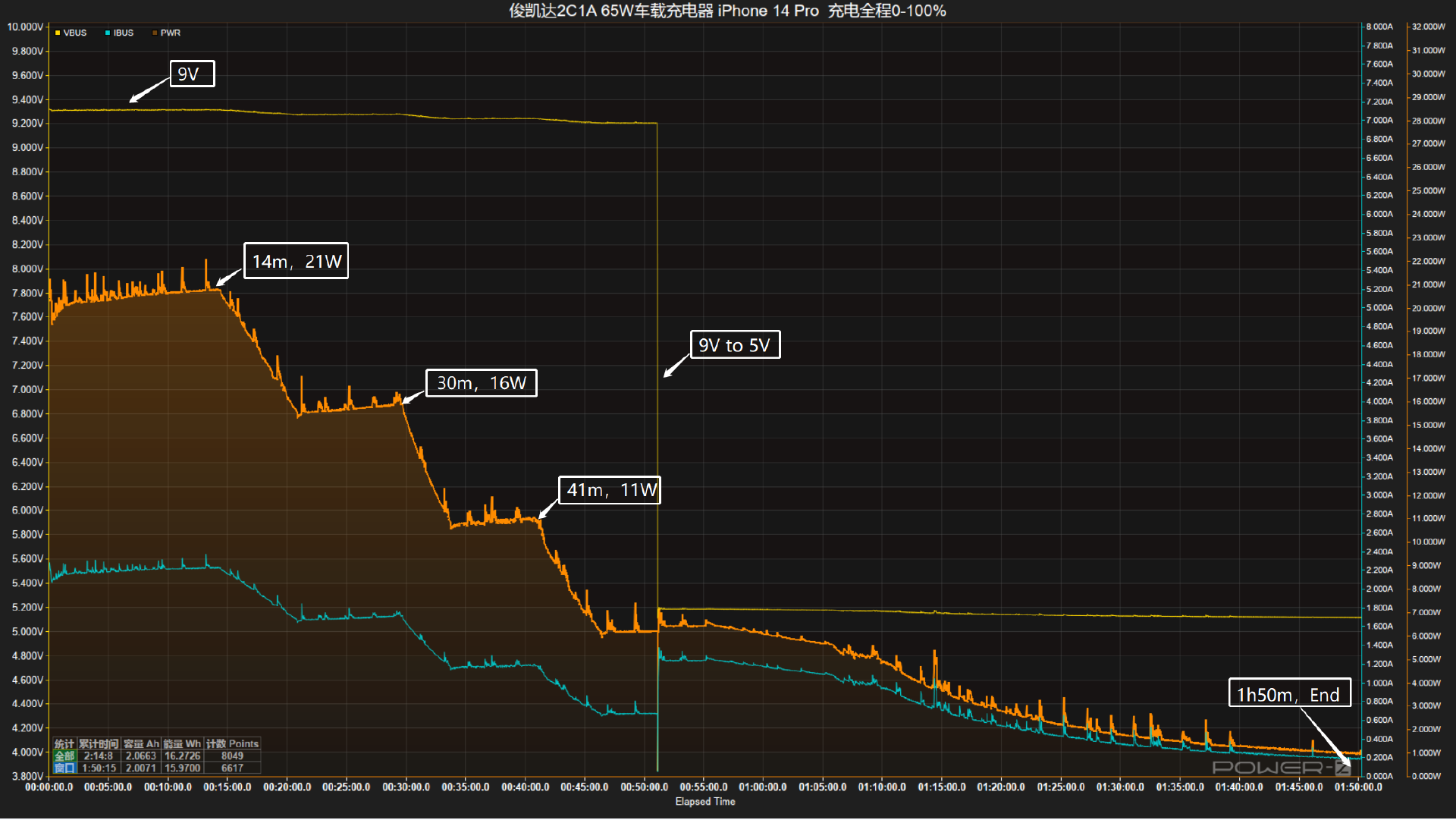 接通电源后,握手9V电压;前14分钟充电功率稳定在21W左右;随后功率下降至16W左右并持续充电至第30分钟;随后功率下降至11W左右并持续充电至第41分钟;随后手机进入涓流充电直至充满,充电全程耗时约1小时50分钟。